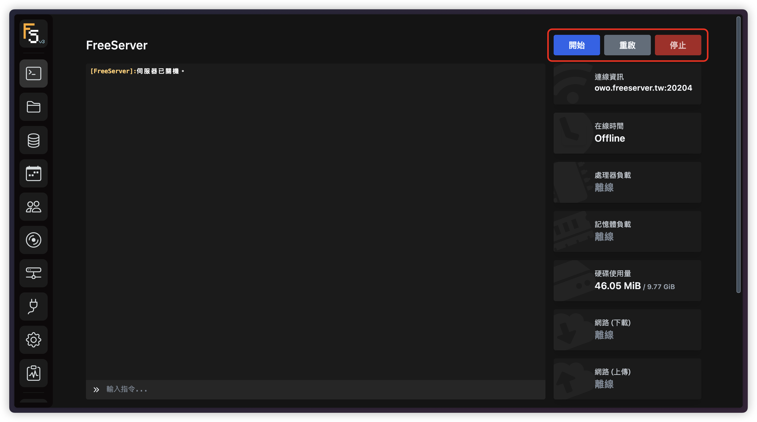您可透過右上方的三個按鈕，進行開始、重啟與停止之操作。